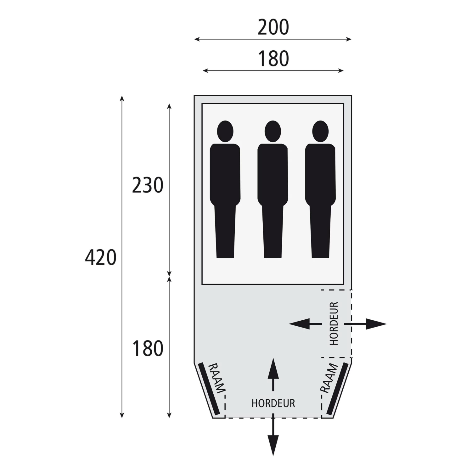 Deze driepersoons oppomptent van Bardani beschikt over een voortent die is voorzien van een vast grondzeil. De hordeur in de voorwand is ideaal voor ventilatie. Ook het ademende materiaal van de tent zorgt voor een betere ventilatie. De gordijnen kunt u traploos verduisteren dankzij het variosysteem.