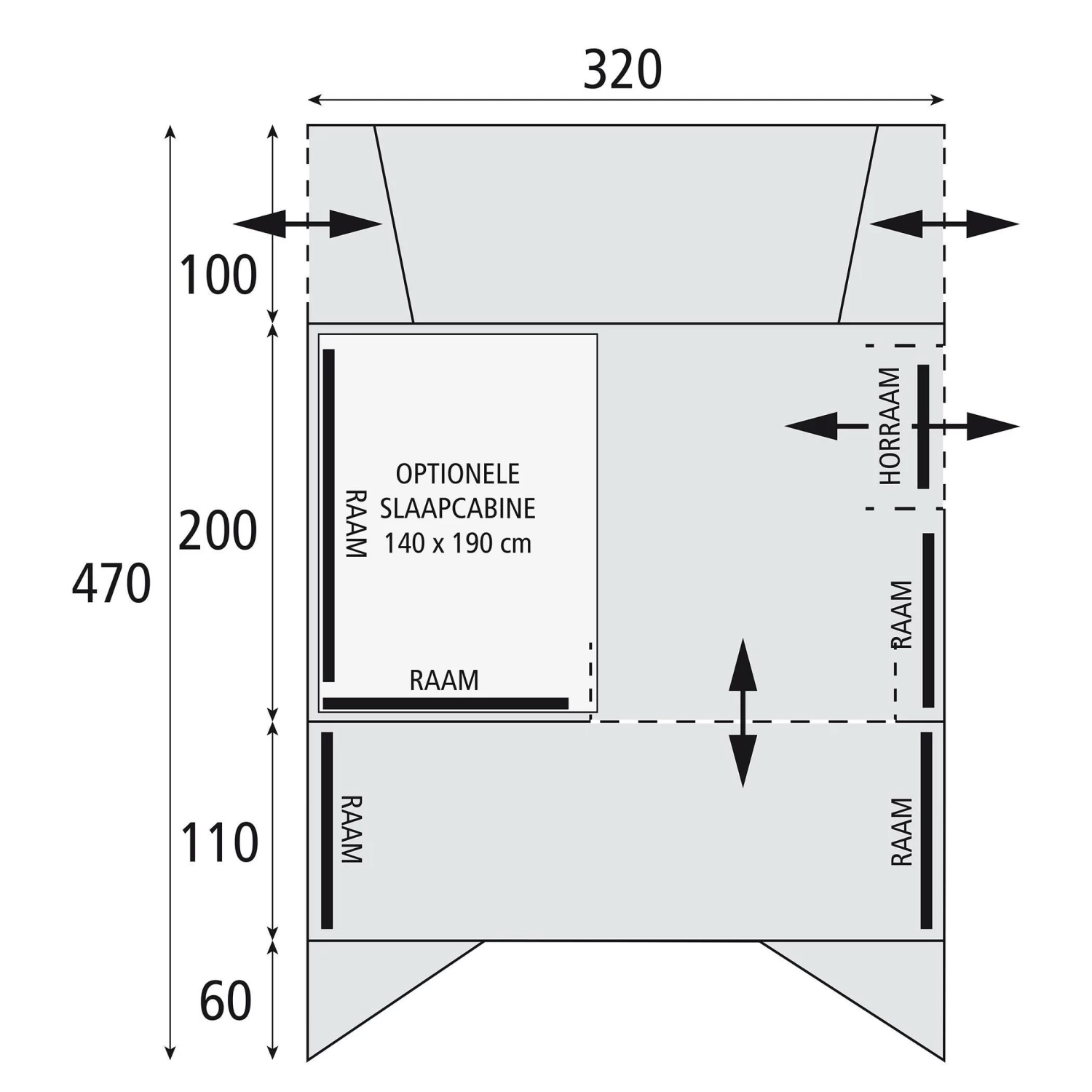 De aansluitsluis is voorzien van een caravankoord en is geplaatst aan de achterkant van de tent. Zowel de voor- en zijdeur zijn oprolbaar en de voordeur is ook als luifel te gebruiken. Dankzij de diverse ventilatiemogelijkheden heeft de tent altijd een aangenaam klimaat.