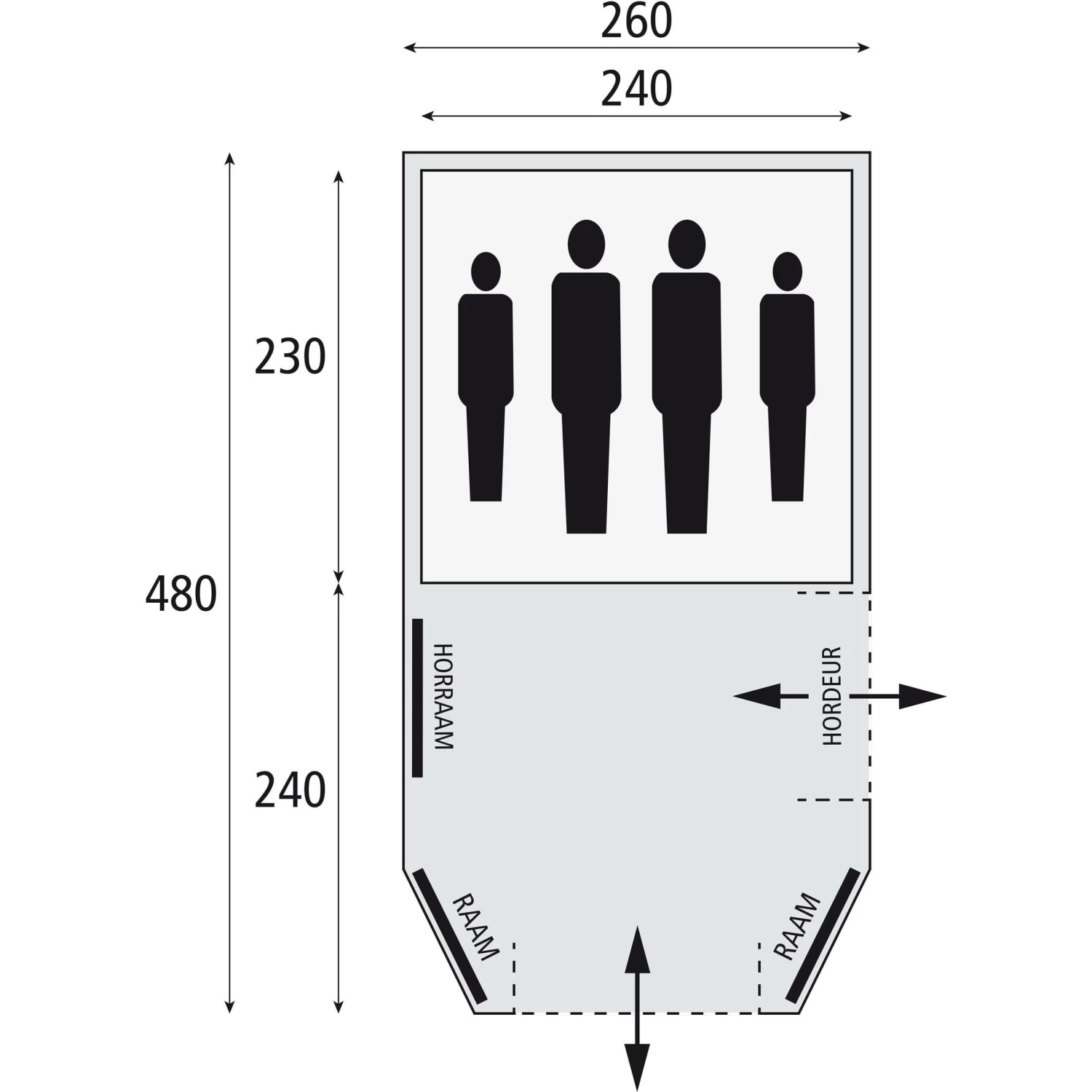 De tent heeft een Permanent “Air Vent” ventilatiesysteem aan de achterzijde voor een goede ventilatie en een stroomkabel doorvoer systeem met ritsen, aan de linker- en rechterzijde. Naast de vooringang heeft de tunneltent een zij-ingang met horraam. Het slaapvertrek heeft een lengte van lengte van 230 cm en is extra donker. De gordijnen hebben een variosysteem voor traploos verduisteren met perfecte afsluiting. De tunneltent is inclusief luifelstokken, haringen, een draagtas en scheerlijnen.
