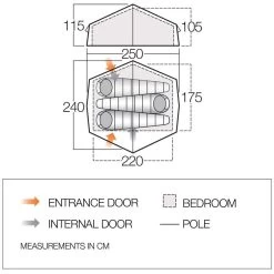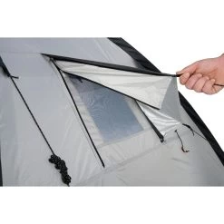 De tunneltent heeft twee slaapcabines, een voor drie personen en een voor twee personen. Beide slaapcabines zijn extra lang, namelijk 230 centimeter. Daarnaast zijn de slaapruimtes extra donker voor optimaal slaapcomfort. De tent heeft scheidingswanden die in- en uitritsbaar zijn waardoor de indeling van de slaapcabines aangepast kan worden. De uitritsbare voorwand heeft een extra brede deur en zorgt voor mogelijkheid tot het vergroten van de leefruimte. In de leefruimte bevinden zich handige opbergvakken. De zij-ingang heeft een volledige horrengaasdeur voor extra ventilatie en extra grote ramen. Aan de voorzijde van de tent is een royale luifel te vinden. Deze luifel heeft wegrolbare zijwanden en horramen die afsluitbaar zijn. Dankzij de extra grote ramen geniet u van meer lichtinval en uiteraard wordt de tent geleverd inclusief draagtas, haringen en reflecterende scheerlijnen.