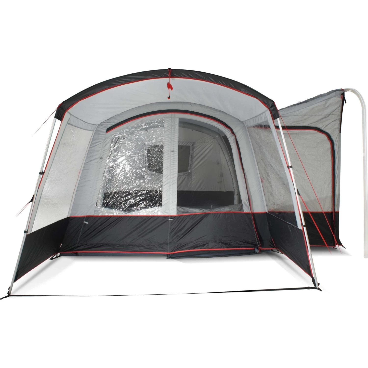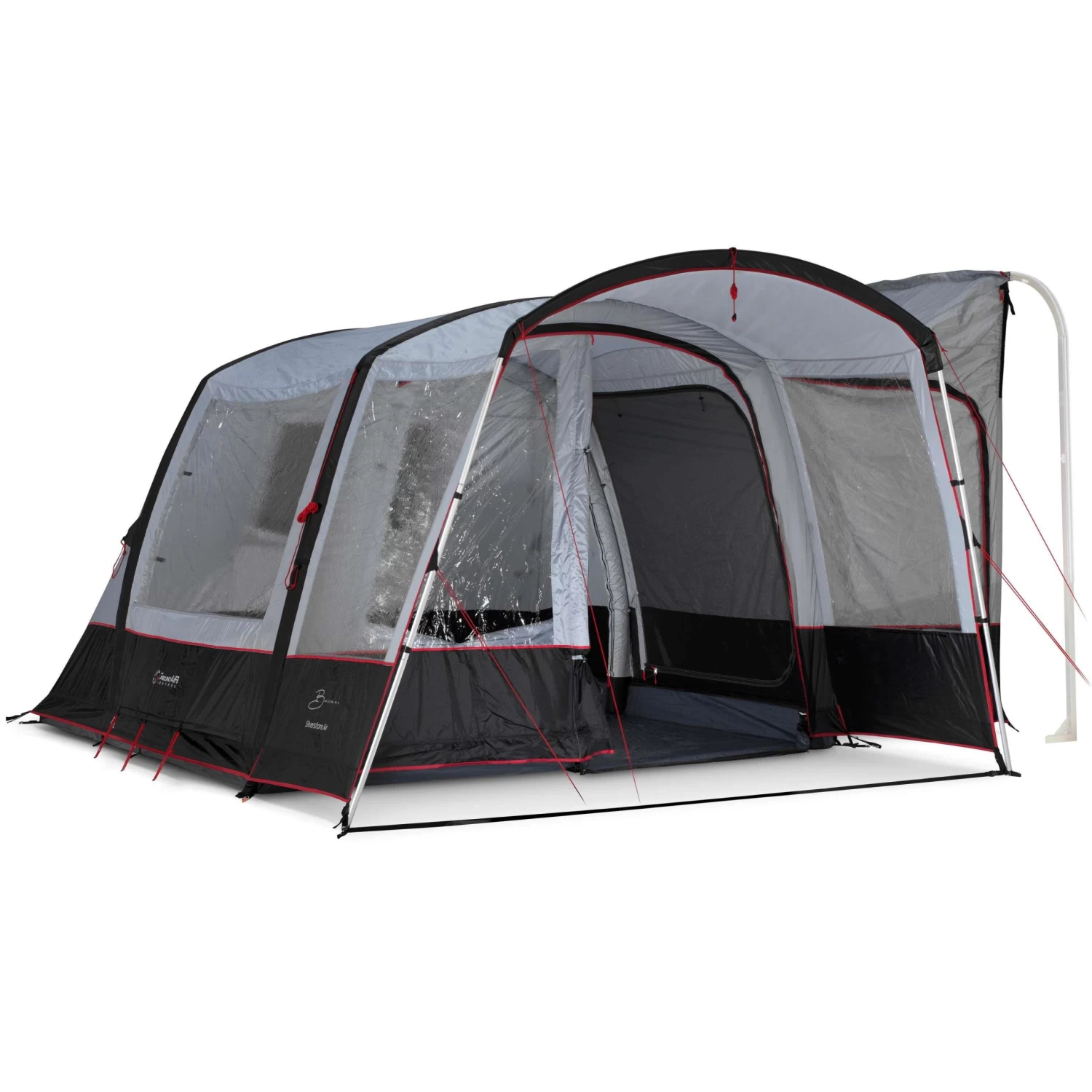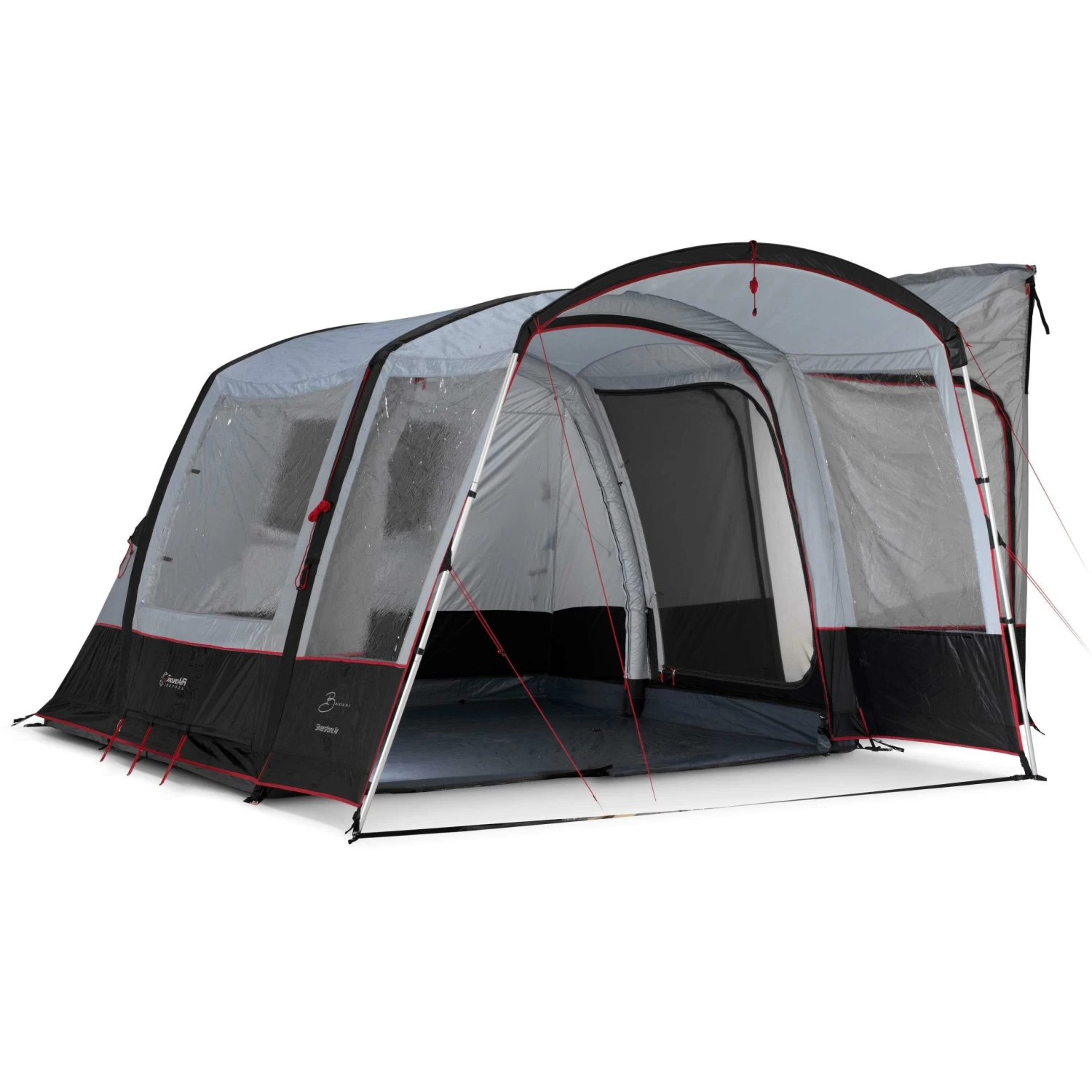 De Bardani Silverstone Air bustent is een snel opzetbare, vrijstaande bustent met een royale luifel en een zij-aansluiting. De tent beschikt over een grote leefruimte van 310 bij 300 centimeter. in deze ruimte kan een optimale donkere slaapcabine worden geplaatst die afzonderlijk verkrijgbaar is.