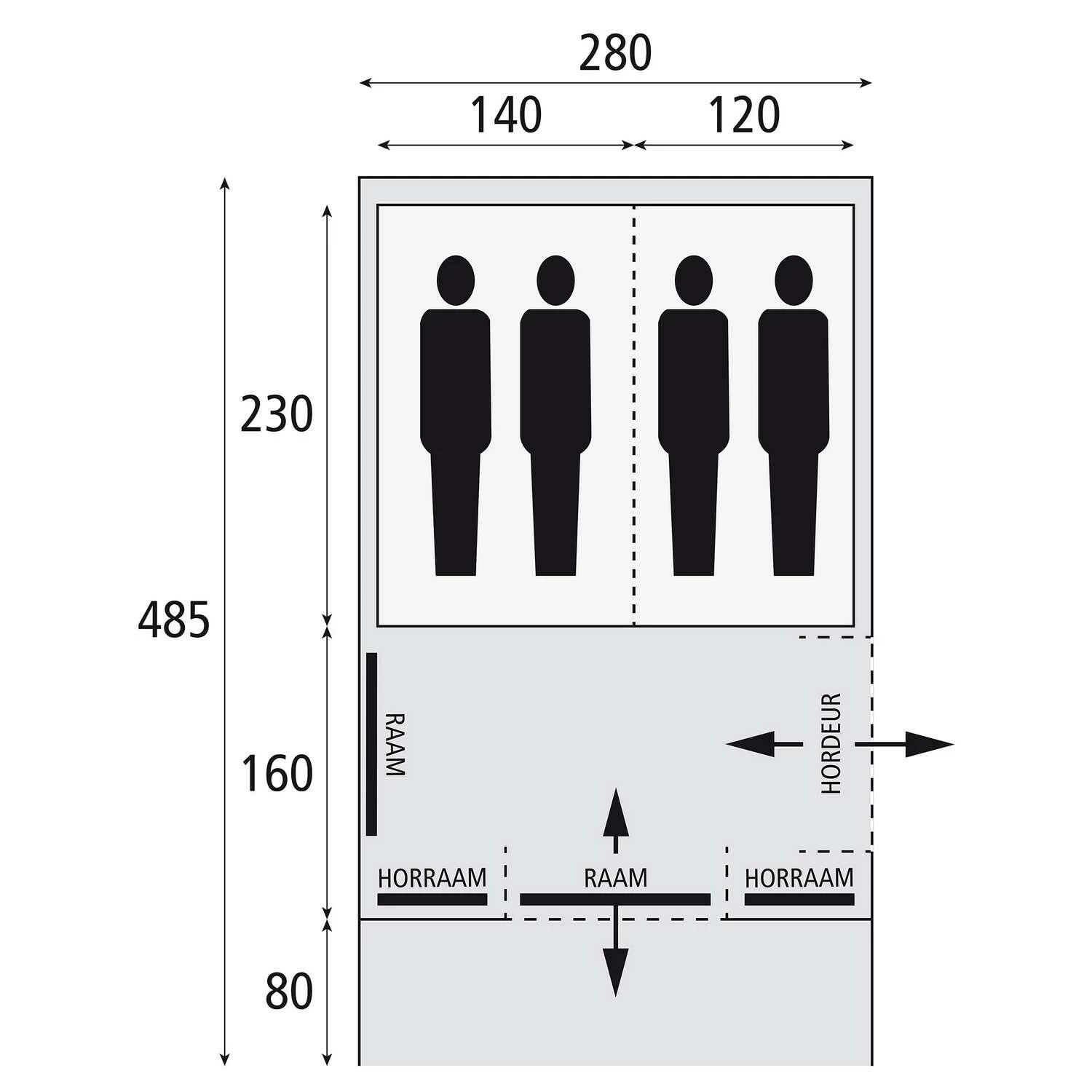 De tunneltent is uitgerust met twee slaapruimte, ieder geschikt zijn voor twee personen. Deze slaapcabines zijn verduisterd en hebben een lengte van 230 cm. De wegritsbare scheidingswand zorgt voor een flexibele indeling van deze slaapcabines.