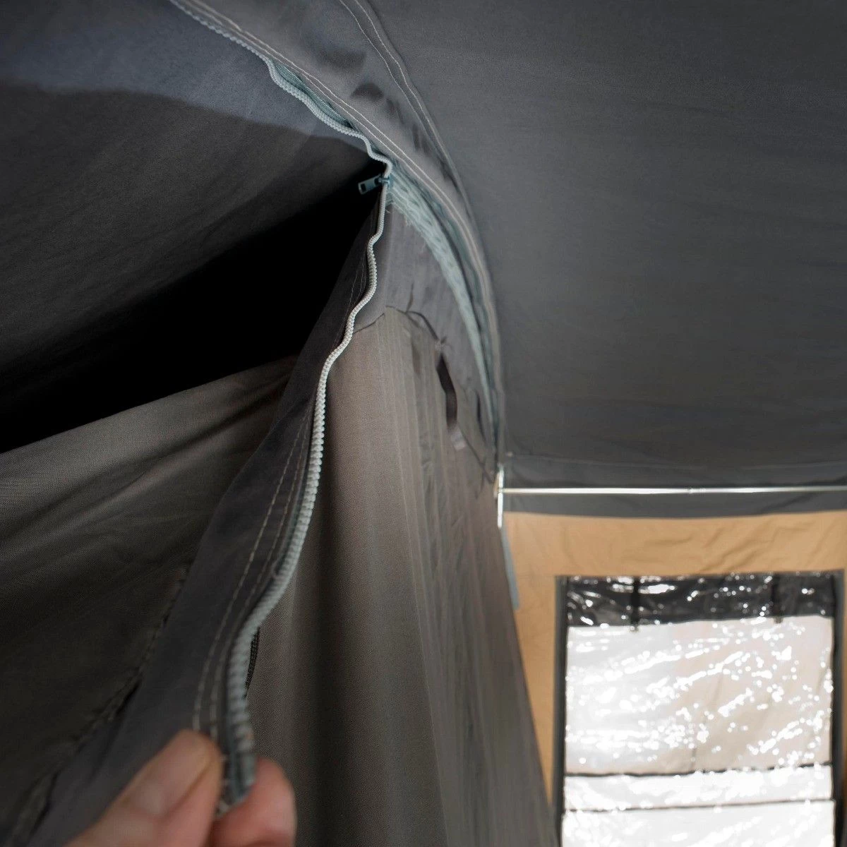De vouwwagen biedt comfort tijdens verschillende weersomstandigheden. Bij regenachtig weer kunt u de voorwand in de luifel plaatsen waardoor u droog zit. Daarnaast blijven uw voeten goed droog. Het bisonyl kuipgrondzeil zorgt er namelijk voor dat er geen water in de tent komt. Als het zonnetje schijnt kunt u lekker buiten zitten onder de zonneluifel. Een combinatie van ventilatieroosters en een ademend tentdoek zorgt voor een uitstekende ventilatie in de tent.