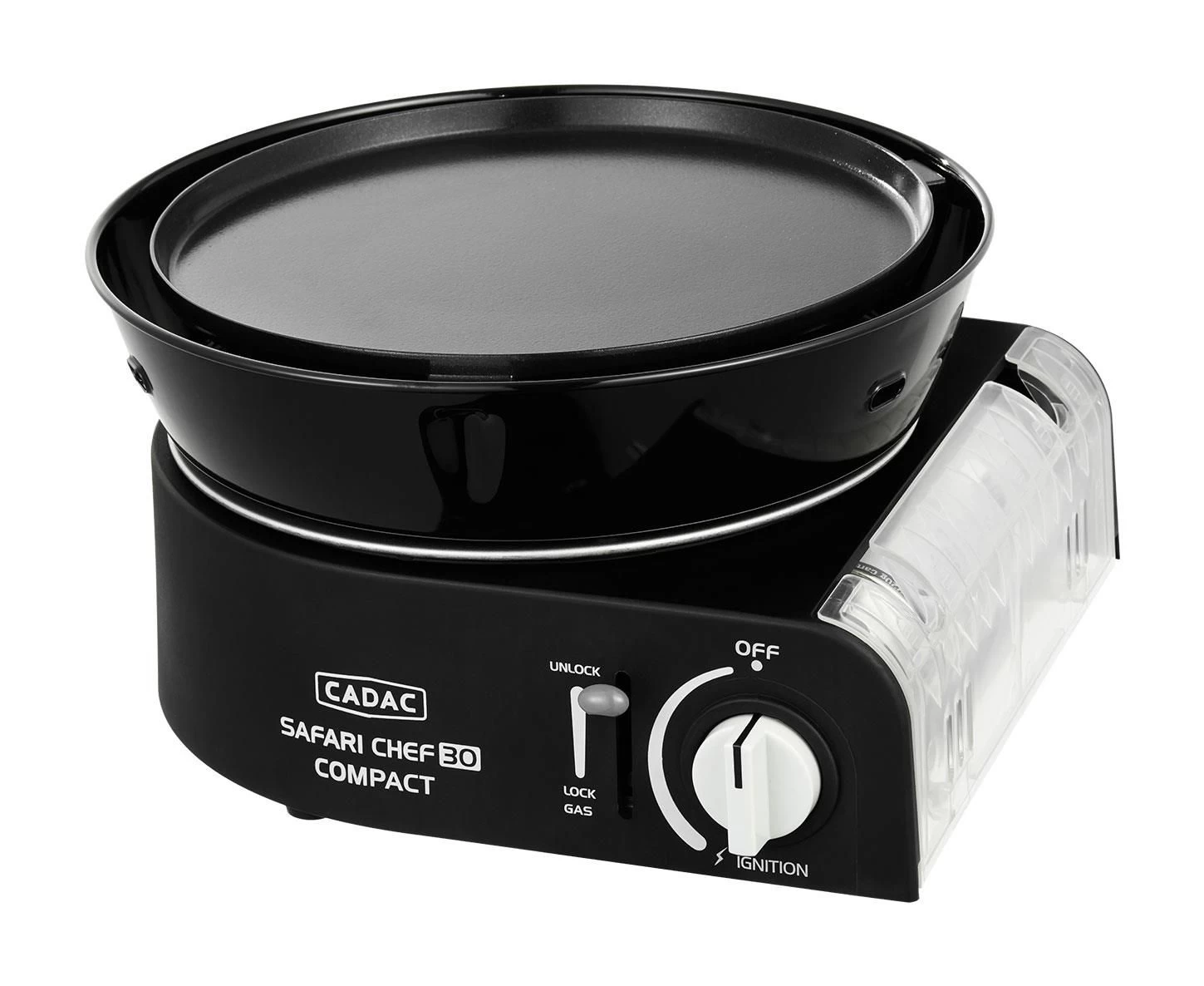 De Cadac Safari Chef 30 Compact is een ultra compacte, lichtgewicht gasbarbecue. Ideaal om tijdens outdoor activiteiten en kampeervakanties te gebruiken. Ondanks zijn kleine formaat is de Safari Chef 30 Compact super veelzijdig en dat allemaal dankzij de verschillende, meegeleverde kookoppervlakken; een pandrager, bakplaat, grillplaat en pan. De bakplaat en het BBQ rooster zijn voorzien van CADAC’s GreenGrill coating. Ze zijn daarom perfect voor het grillen en bakken van vlees, vis en groentes. De Cadac Safari Chef 30 Compact barbecue heeft een lekbak die kookresten opvangt, maar die ook kan dienen als windscherm zodat de brander niet uitwaait. De barbecue werkt namelijk rechtstreeks op een 227 gram gascartridge. De deksel kan ook gebruikt worden als (soep)pan! Een stevige draagtas wordt meegeleverd, zodat u deze gasbarbecue eenvoudig overal mee naartoe neemt.
