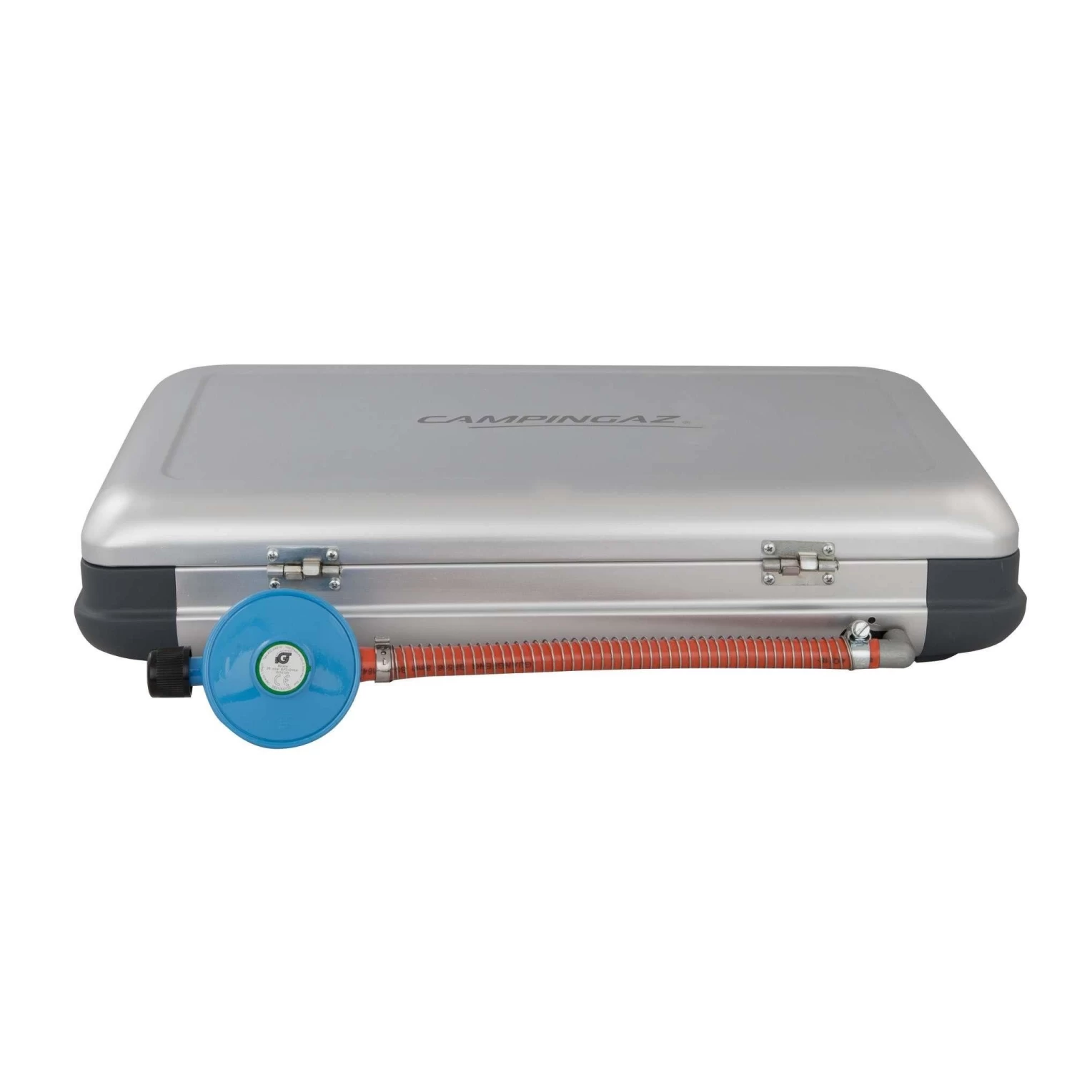 Het Campingaz Camping Kitchen 2 CV kooktoestel is geschikt voor weekendjes weg, uitstapjes of vakanties. Het kooktoestel is licht, draagbaar en heeft twee pitten. Het platte model is ruimtebesparend. Het kooktoestel heeft een robuuste stalen deksel en hittebestendige zijpanelen. Deze zijpanelen van geëmailleerd staal zijn vaatwasserbestendig en bieden daarnaast bescherming tegen wind. Het toestel is geschikt voor twee pannen met een diameter van 24 centimeter. De Easy Clic PLUS aansluiting zorgt ervoor dat patronen gemakkelijk geplaatst en verwijderd kunnen worden.