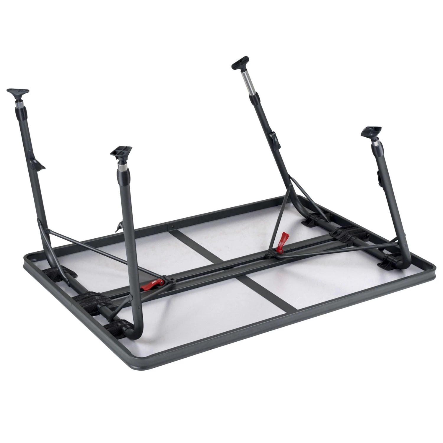 De campingtafel van Crespo is een stabiele, lichtgewicht tafel van hoge kwaliteit. De inklapbare AP-273 campingtafel biedt ruimte aan 6 personen en is extra stevig dankzij het aluminium frame. Het tafelblad is watervast en hittebestendig wat de levensduur verlengt. De poten hebben stabilisatie voetjes waardoor de tafel op vrijwel elke ondergrond een goede grip heeft. Daarnaast zijn de poten na het inklappen stevig te bevestigen in de geleide aluminium rails aan de onderkant. De tafelpoten hebben een extra dikke en verstevigde buis voor een hoge stabiliteit.