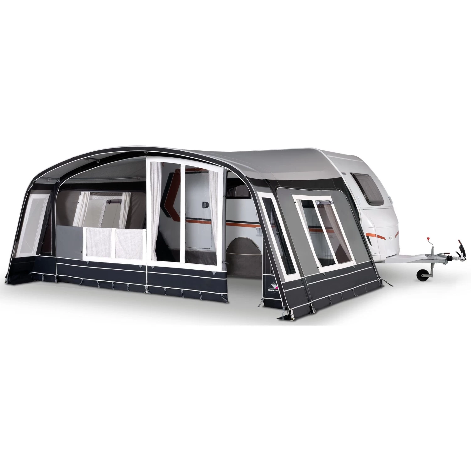 Deze Doréma voortent heeft een diepte van 270 centimeter en door de diepe petluifel kunt u extra ruimte creëren. De grote ramen laten veel licht door en zijn voorzien van gordijnen zodat u meer privacy kunt creëren. De grote voortent biedt genoeg leefruimte voor extra kampeercomfort. De voortent is standaard voorzien van afneembare slikranden zodat u het eenvoudig kunt schoonmaken. De naden van de voortent zijn waterdicht zodat u droog in de tent blijft. De bijgeleverde haringen zijn stevig en zorgen ervoor dat de voortent goed blijft staan.