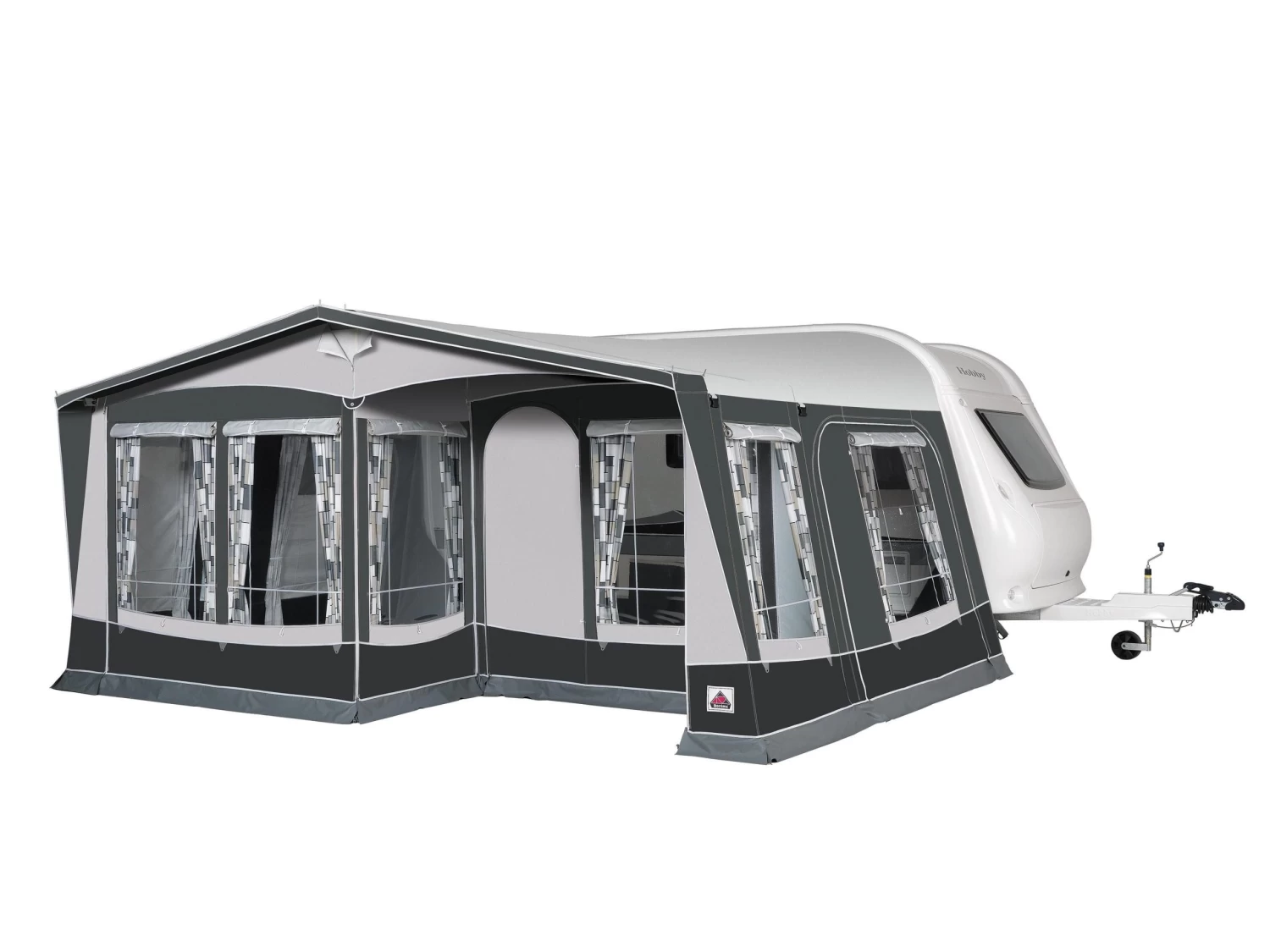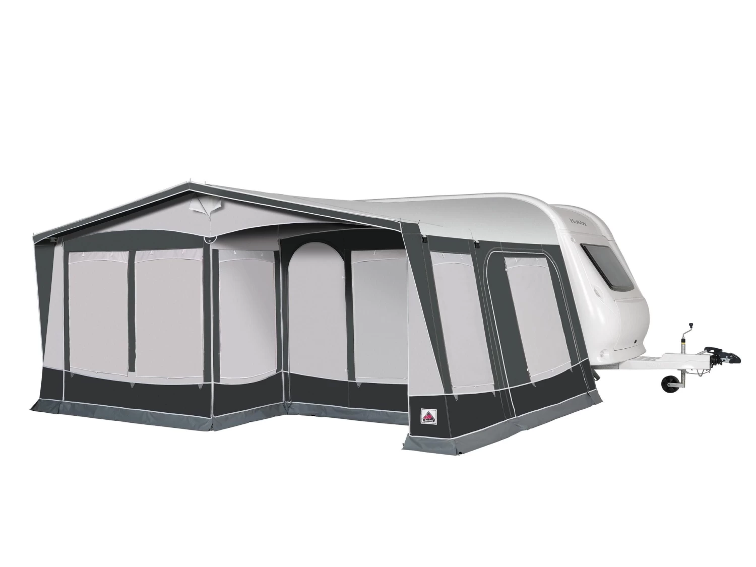 De Doréma Royal 350 De Luxe voortent doet zijn naam eer aan. Deze zeer royale voortent voegt een groot oppervlak toe aan uw kampeerruimte. De voortent heeft een bijzondere, maar ook zeer praktische indeling.