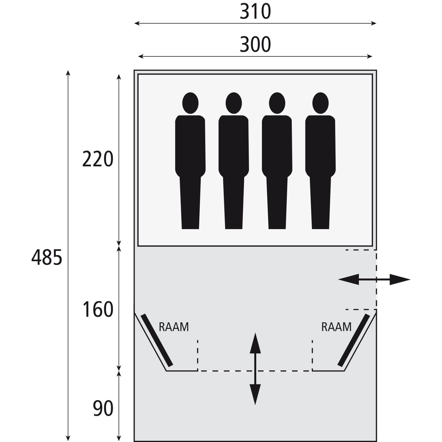 De Key Largo tent heeft een ruim leefgedeelte van 160 x 310 centimeter. Dit model is voorzien van twee ramen en twee deuren. De ramen zorgen voor veel lichtinval waardoor de tent ruimer lijkt. Het gescheiden slaapgedeelte van deze tent heeft een afmeting van 220 x 300 centimeter en is groot genoeg voor 4 personen. Daarnaast is deze koepeltent voorzien van een vaste luifel van 90 x 310 centimeter.