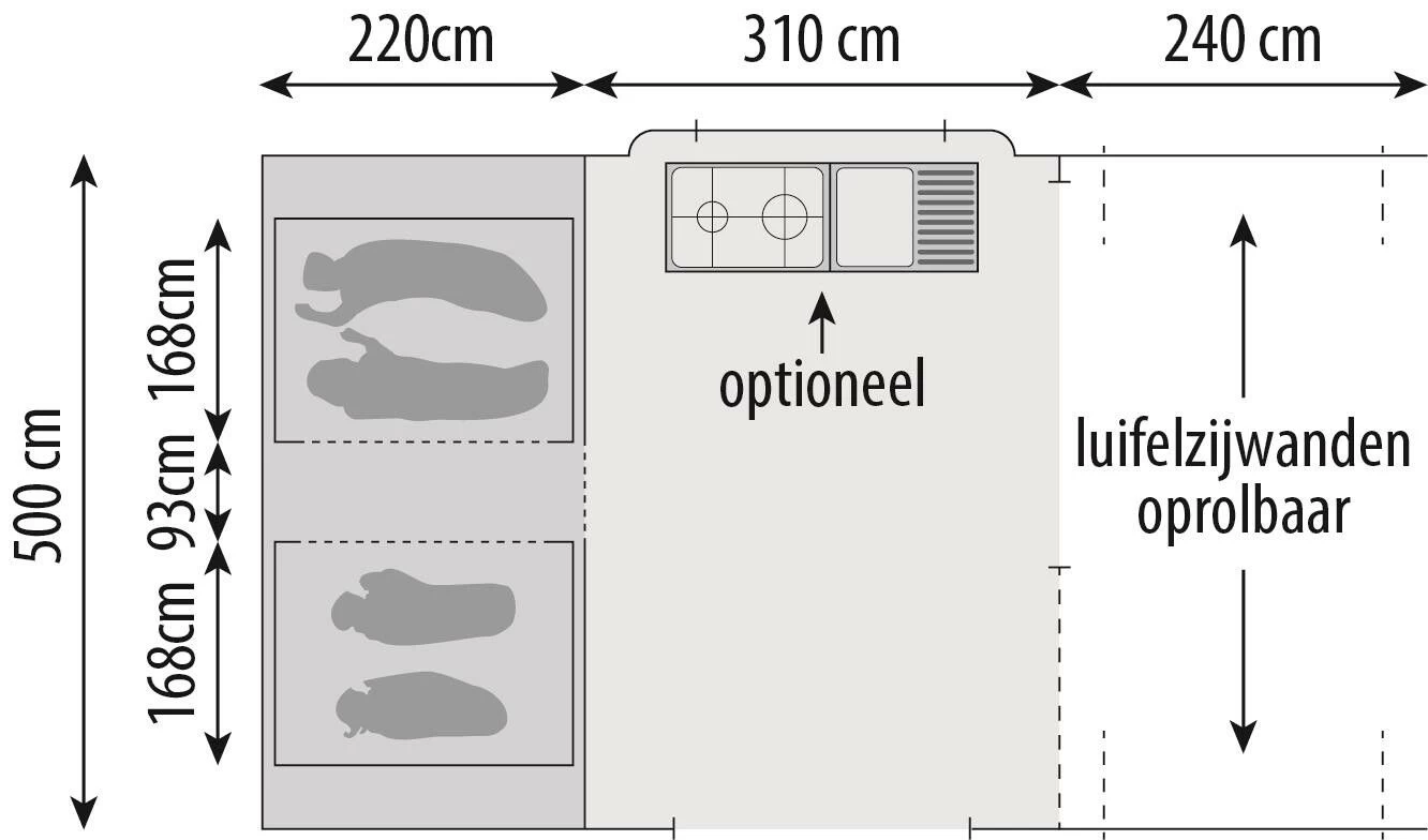 Om lekker in de schaduw te kunnen zitten of te schuilen voor regen, heeft de vouwwagen een royaal vast luifel van bijna 2,5 meter diep. De zijwanden zijn oprolbaar en hebben afsluitbare ramen. Verder heeft de Sunrider een symmetrisch uitklapsysteem, waardoor u deze gemakkelijk en snel kunt op- en afbouwen. Ideaal wanneer het regent. Verder biedt de vouwwagen goede ventilatiemogelijkheden. U kunt trouwens ook alleen de wagentent opzetten. Super handig wanneer u ergens maar één nacht verblijft. Dat maakt de Sunrider ideaal voor een reis met meerdere tussenstops.