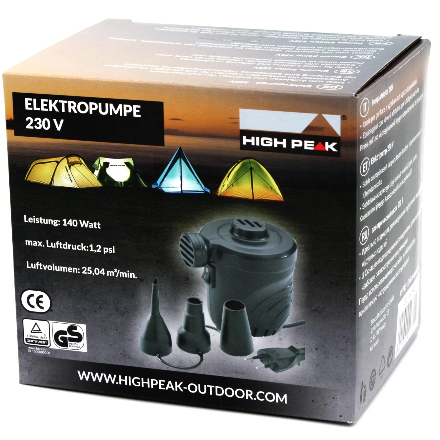 De High Peak 230V 140W elektrische pomp wordt standaard met verschillende adapters geleverd, waardoor deze pomp op bijna alle gangbare ventielmaten kan worden aangesloten. Deze High Peak elektrische pomp is door zijn compacte formaat eenvoudig mee onderweg te nemen. De pomp zorgt ervoor dat uw opblaasbare objecten binnen een handomdraai zijn opgeblazen of leeggelopen.