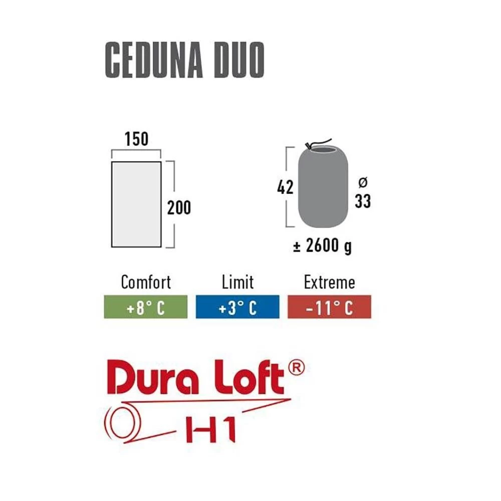 De High Peak Ceduna Duo slaapzak in de kleur anthracite blue is gemaakt van polyester en heeft een Dura Loft voering. Deze High Peak slaapzak is voorzien van een rits die in twee richtingen open gemaakt kan worden. Aan de binnenzijde zit een zakje, hier kunt u persoonlijke eigendommen in plaatsen wanneer u gaat slapen zodat u deze dichtbij heeft. De slaapzak is geschikt voor twee personen en wordt geleverd met een foedraal.