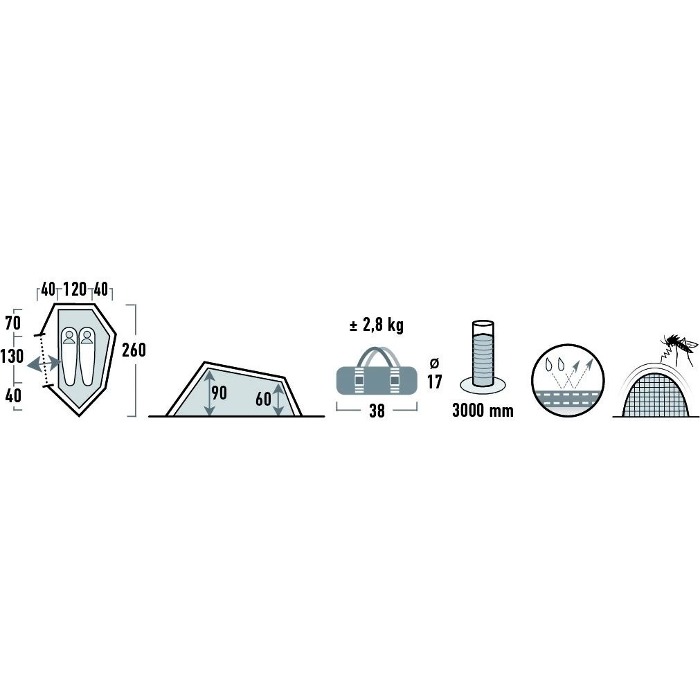 De High Peak Sparrow 2 tunneltent heeft een brede zij-ingang en een deur die beide voorzien zijn van gaas, zodat insecten buiten blijven. De achterzijde is lager dan de voorkant en deze tent heeft ruimte voor 2 personen. De vloerstreep heeft een opvallende kleur en is goed zichtbaar in de schemering. Er zijn binnenzakken en een lamphouder aanwezig in de tent. De tent is goed ventilerend en de binnentent stof is ademend. De binnenkant zit vast aan de buitenkant en zorgt voor makkelijker opzetten van de tent. Duw de stangen erin, span ze aan en de tent is klaar. Ideaal voor festivals of korte reisjes.