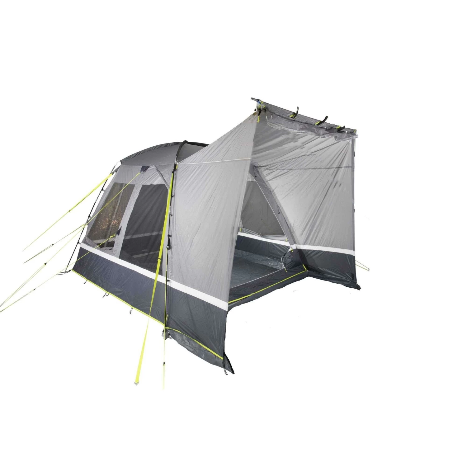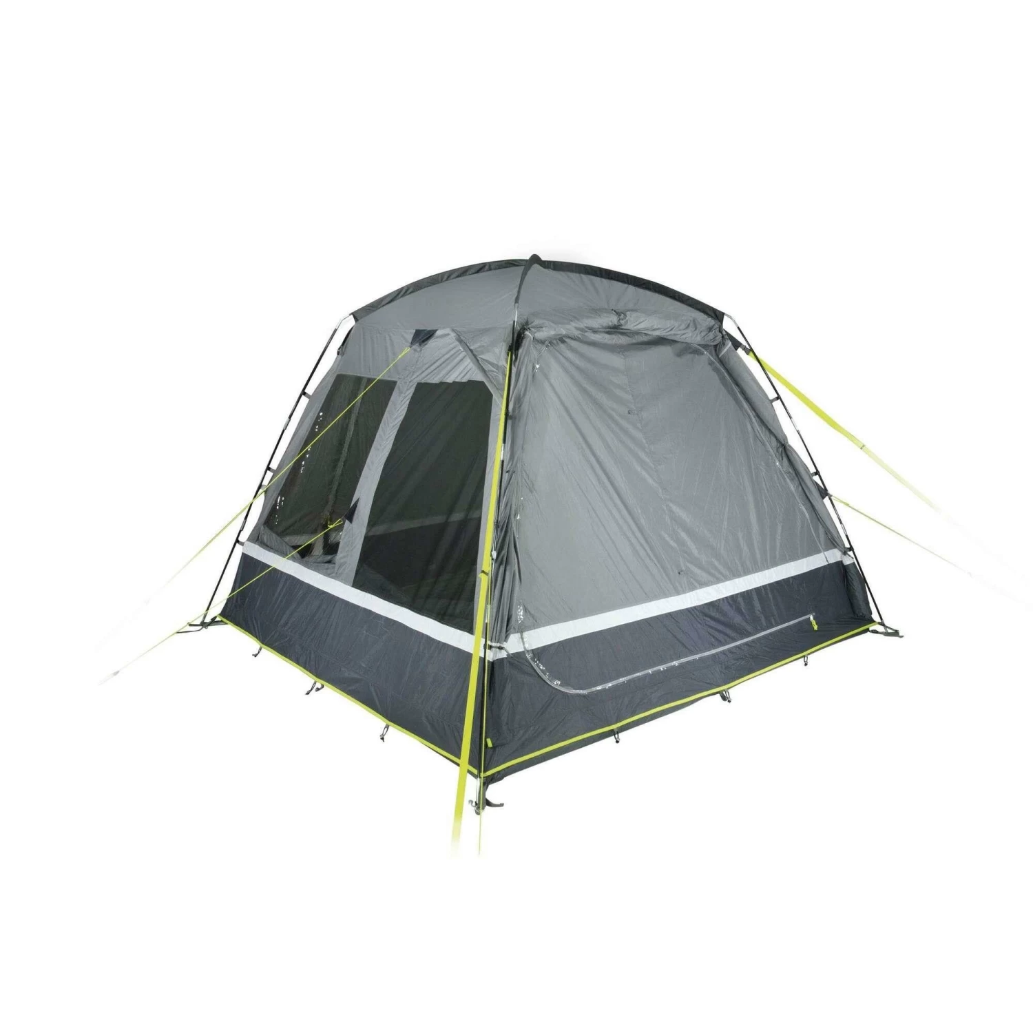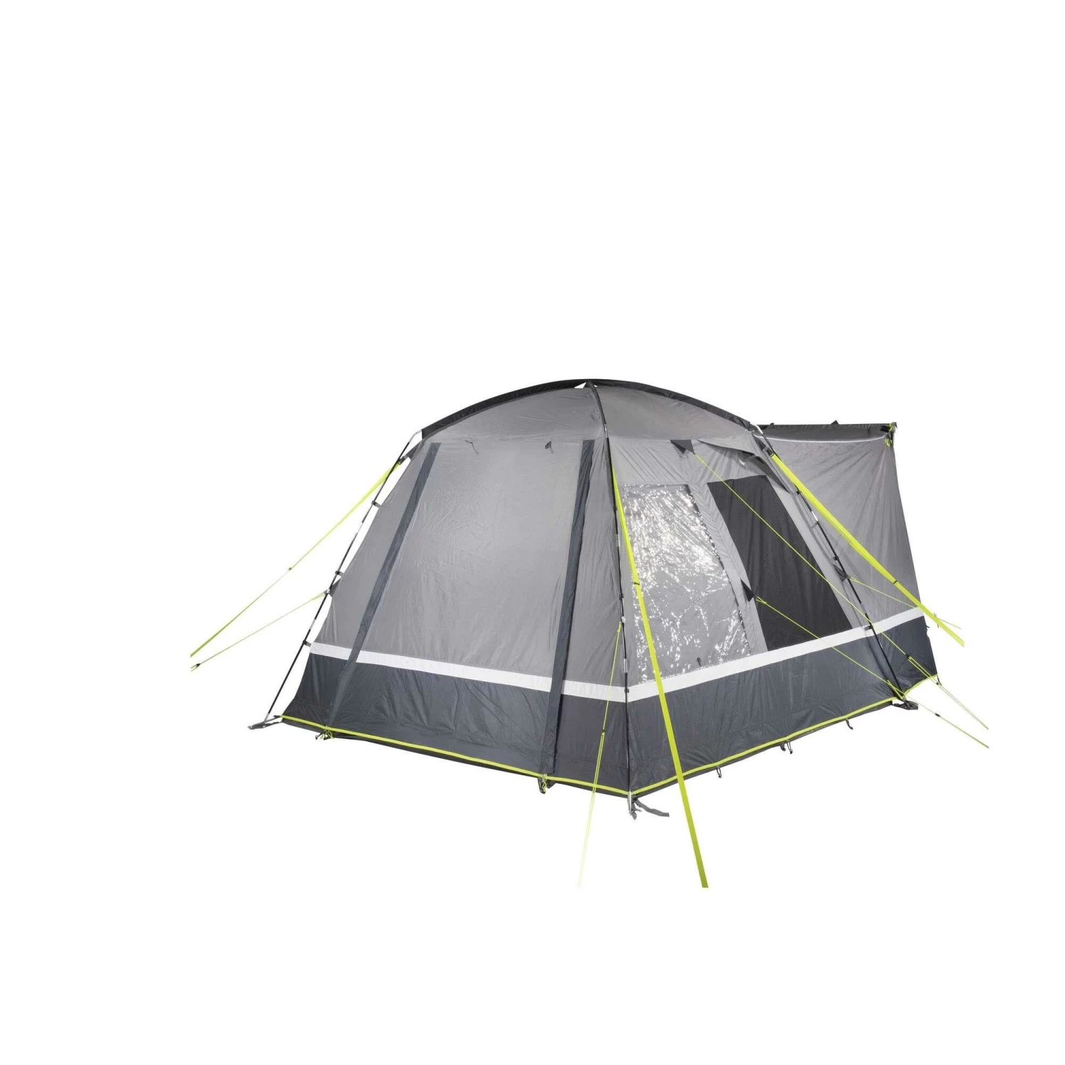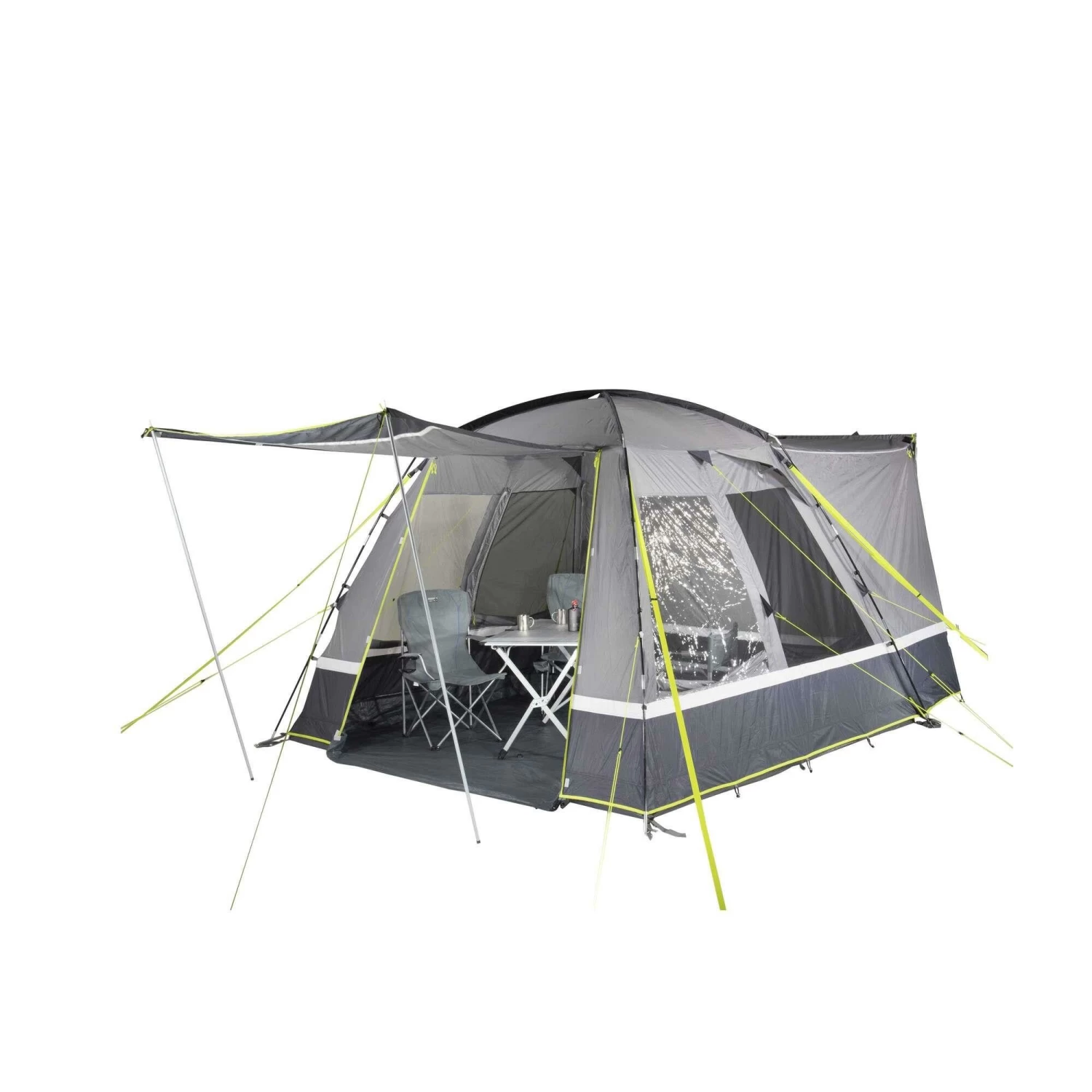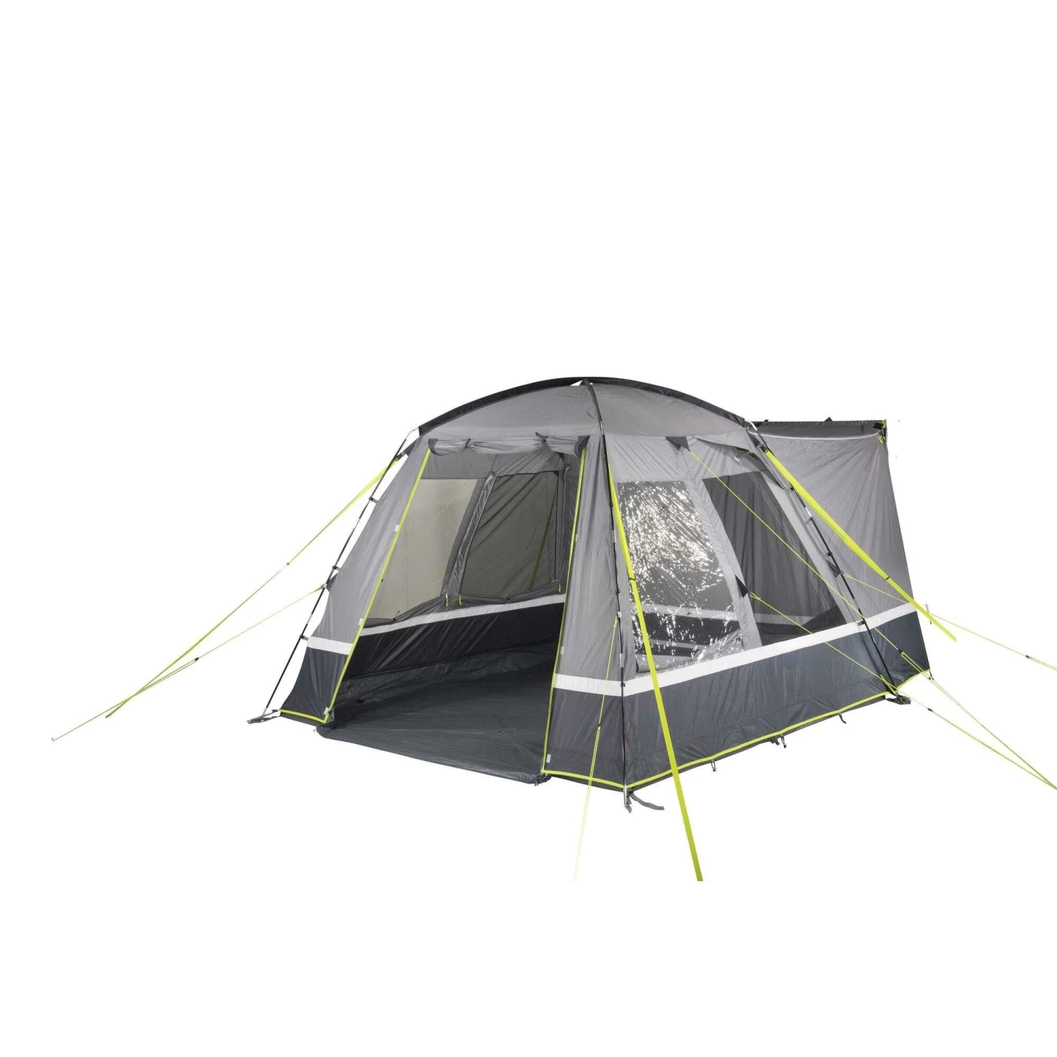 Het PE grondzeil, die stevig aan de buitentent is vastgenaaid, voorkomt het binnendringen van vuil, vocht en insecten en beschermt tegen tocht. De bodempan is aan de voorzijde neerklapbaar en voorkomt struikelgevaar. De hoogwaardige aluminium staven hebben een diameter van 12,7 millimeter. Afhankelijk van het weer kan het verandafront halverwege of helemaal geopend worden. De twee gaasramen van extra sterk, scheurvast 150 D “Superfine” klamboe, ventileren het woongedeelte en houden insecten buiten de tent. De binnenflap met ritssluiting is, afhankelijk van de weersomstandigheden, eenvoudig en variabel te bedienen. De zijdeur van gaas gemaakt van 150D “Superfine” muskietennet biedt meer bewegingsvrijheid en ventilatie. Ook de twee transparante folievensters met ritssluiting aan de binnenkant van het raam zijn eenvoudig en variabel te bedienen.