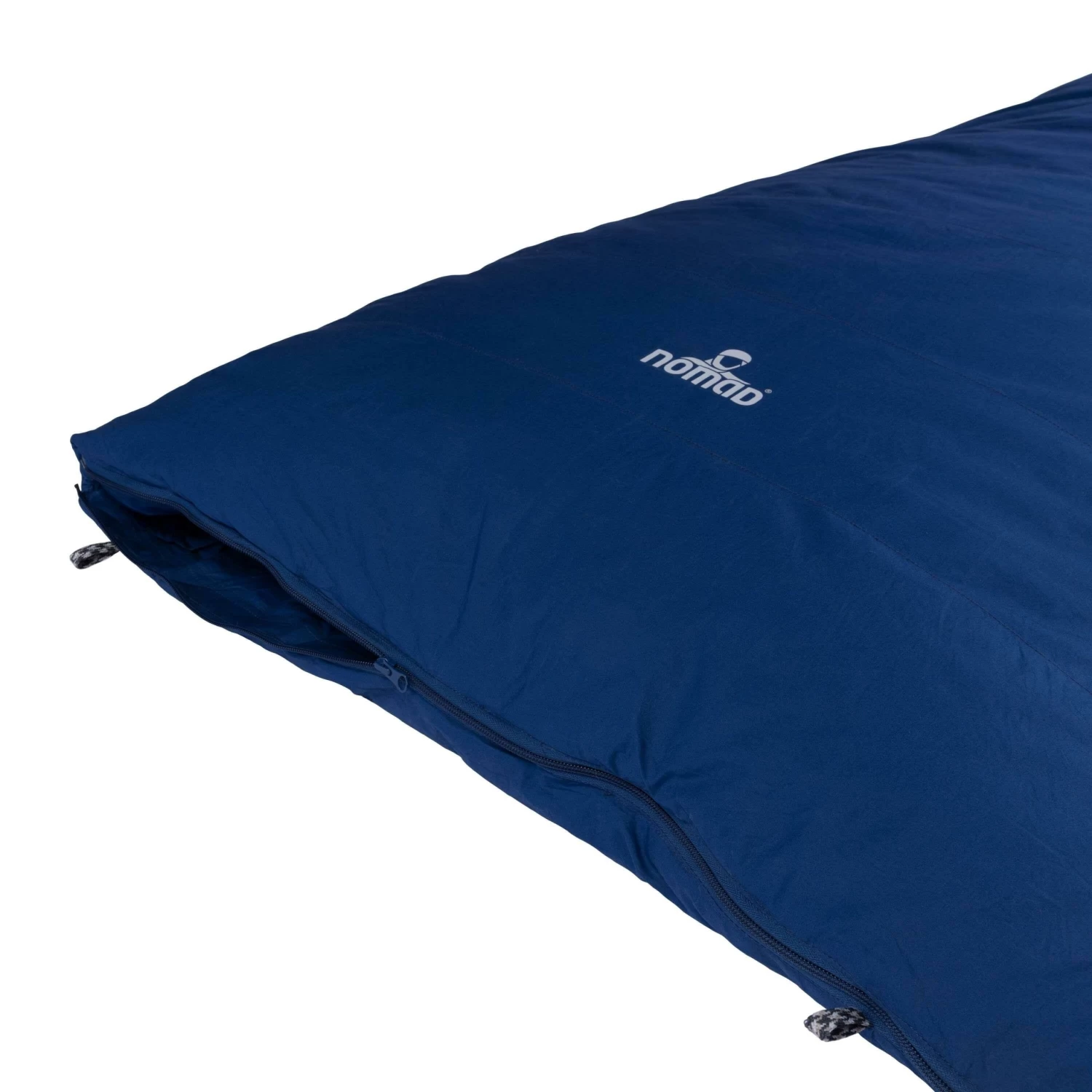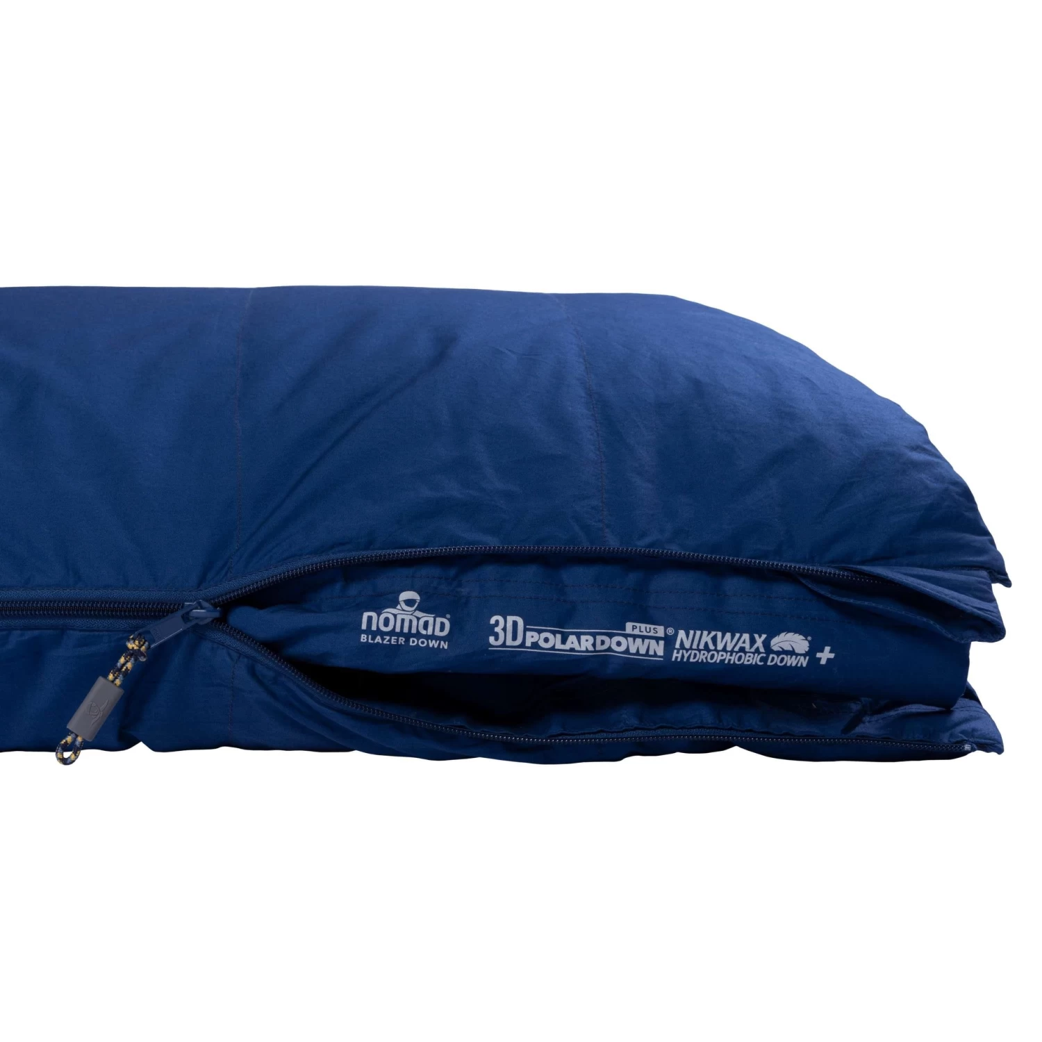 De Nomad Blazer Down is een hoogwaardige dekenmodel slaapzak met een vulling van dons en een binnen- en buitenkant van heel zacht en lichtgewicht perkal katoen. De slaapzak is gevuld met 3D-Powerdown Plus. Dat is een lichtgewicht vulling die voor 80 procent bestaat uit ganzendons en voor 20 procent uit 3D hollowfibre. Dat is een synthetische, holle vezel die warmte heel goed vasthoudt. De vulling heeft een Nikwax waterproof treatment ondergaan. Bij deze Nomad slaapzak wordt een mesh opbergzak geleverd en met een compressiehoes. Wordt de slaapzak voor langere tijd opgeborgen, gebruik dan de mesh opbergzak. Gaat de slaapzak mee op reis, dan is de compressiehoes de betere keuze.