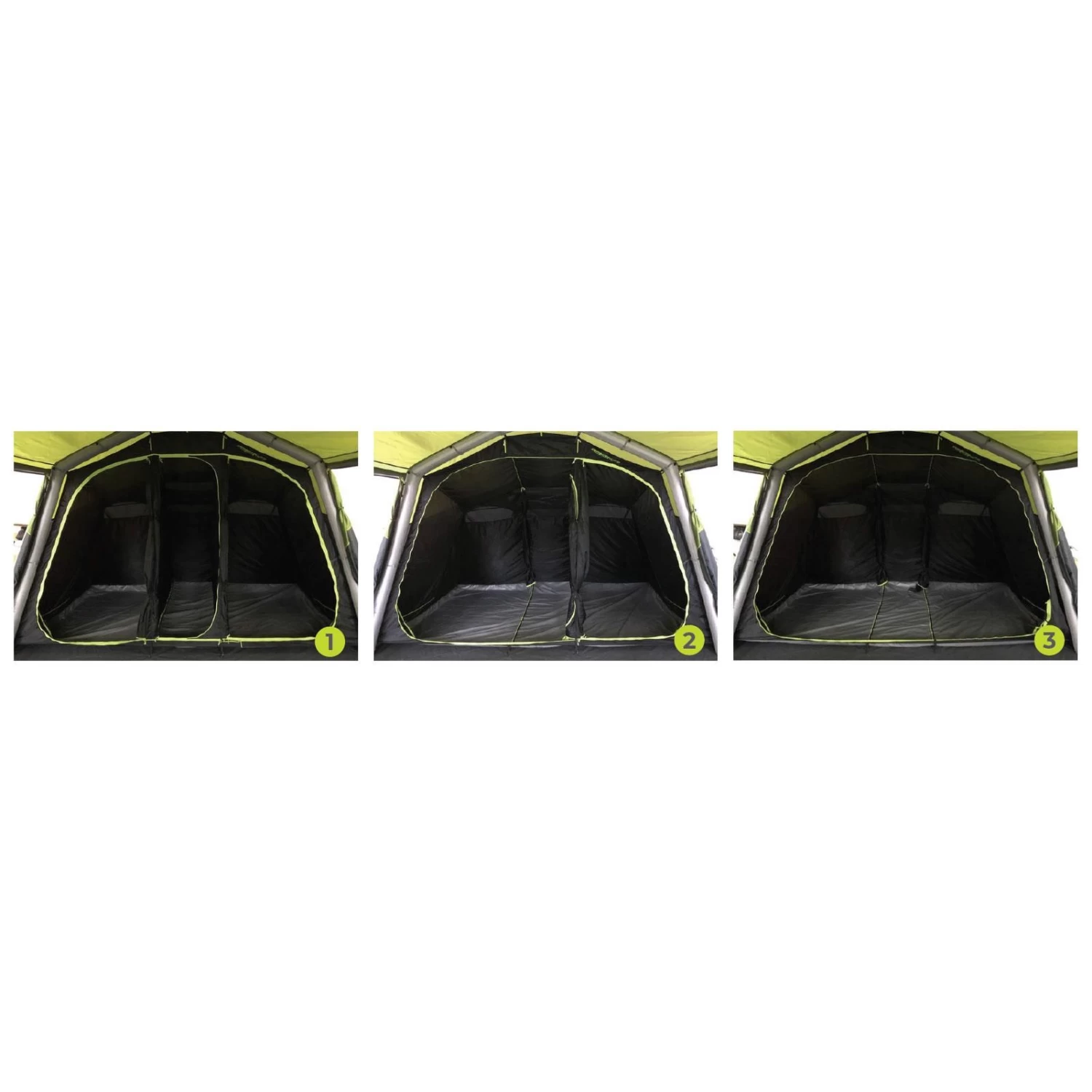 In deze familietent zijn drie slaapcabines aanwezig, waarvan een grote cabine kan worden gemaakt door de scheidingswandjes weg te rollen.